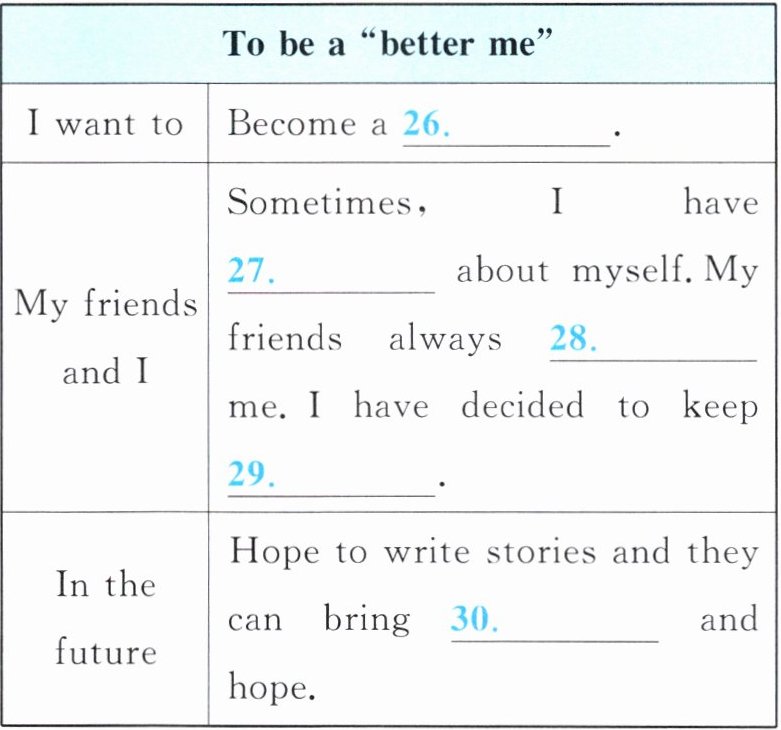 (26. writer 27. doubts 28. encourage 29. trying 30. joy)