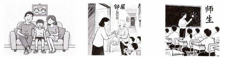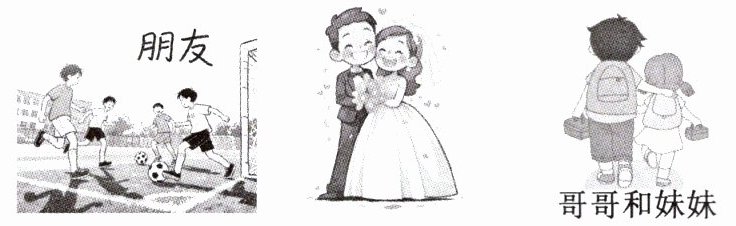 在日常生活中,我们经常需要与他人相处,如父母、老师、兄弟姐妹或朋友等。你能用英语写出下列图片表达的不同人物关系的名称吗?