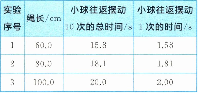 |实验序号|绳长/cm|小球往返摆动 10 次的总时间/s|小球往返摆动 1 次的时间/s|