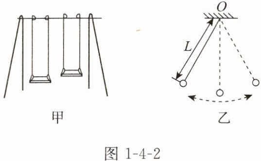 公园里两个绳长不同的秋千如图 1 - 4 - 2 甲所示,小亮在荡秋千时发现这两个秋千往返一次的时间不同,他猜想秋千往返一次的时间与绳长有关。于是用细线系上一个小球模拟秋千,如图 1 - 4 - 2 乙所示,每次让小球由静止释放,且保持释放时悬线和竖直方向的夹角不变,改变绳长进行探究,记录结果如下表所示。