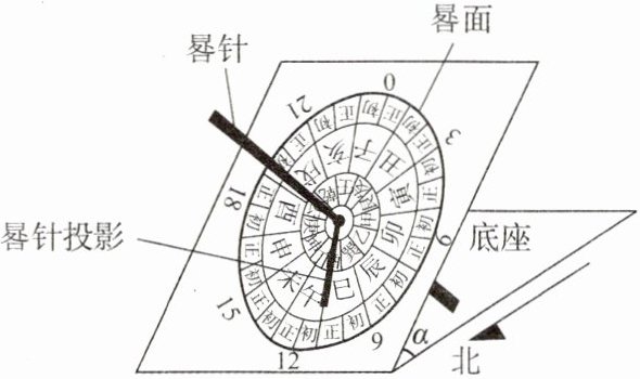 【任务二】制作简易的赤道式日晷。如图所示,将一块硬纸板折叠一个角度α(α = 90° - 当地的地理纬度)后分别充当晷面与底座,用圆规在晷面上画一个直径不小于15cm的圆形,将圆等分为12部分,对应全天的12个时辰(即子、丑、寅、卯、辰、巳、午、未、申、酉、戌、亥),每个时辰对应2个小时,用直尺和笔在圆上标出时间刻度,用细杆垂直穿过晷面中心当作晷针。使用时,把制作好的日晷放置在无遮挡的水平地面上,在阳光下观测晷针在晷盘上的投影即可。
