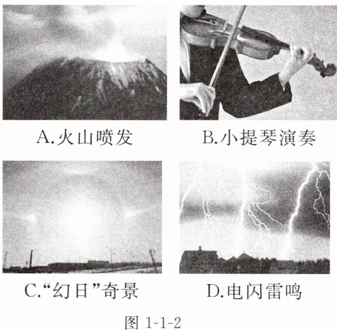 (图1-1-2包含A.火山喷发、B.小提琴演奏、C.“幻日”奇景、D.电闪雷鸣)
