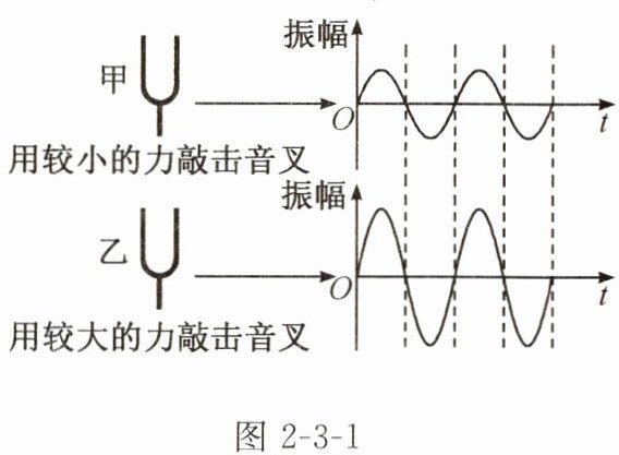 在波形图中,声波显示出来的振幅越大,响度越______。由图2-3-1可知:图中______(选填“甲”或“乙”)音叉产生声音的响度较大。