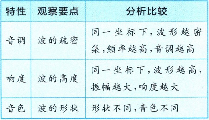 |音调|波的疏密|同一坐标下,波形越密集,频率越高,音调越高|