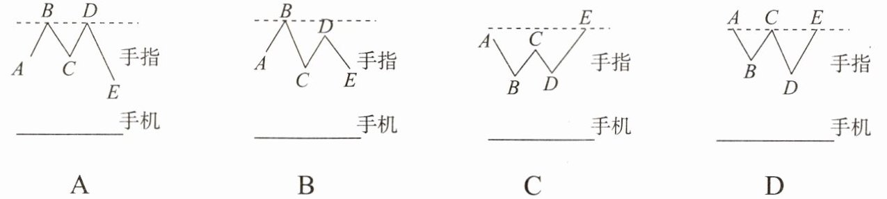 放大手指的局部,可观察到其表面是凹凸不平的。如图所示,超声指纹识别系统在发出超声波遇到手指上 $A、B、C、D、E$ 五个位置后,测得回波信号的时间分别为 $0.30ms$、$0.36ms$、$0.30ms$、$0.36ms$、$0.26ms$。根据时间,求出手指与手机平面的距离,就可以绘出指纹的大致形状,则该处指纹的大致形状为下图中的____。(填字母代号)。