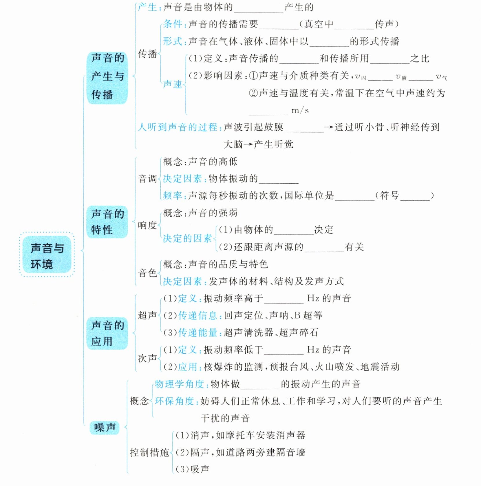 (2)影响因素:①声速与介质种类有关,$v_{固}$______$v_{液}$______$v_{气}$②声速与温度有关,常温下在空气中声速约为______m/s