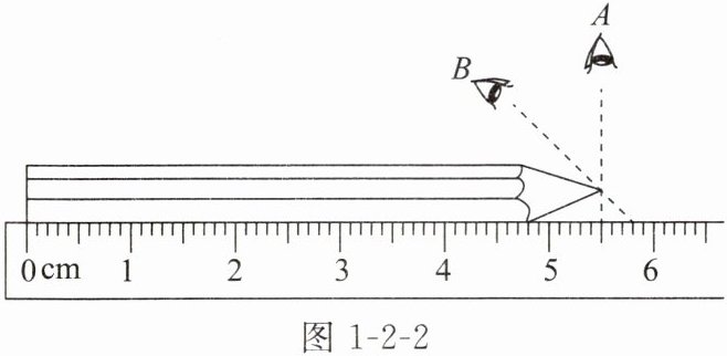 例 1 如图 1 - 2 - 2 所示,用刻度尺测量一支铅笔的长度,其中读数方法正确的是______(选填“A”或“B”),该刻度尺的分度值为______ mm,测得铅笔的长度为______ cm。