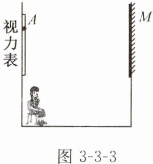 检查视力时,为节省空间,常让被测者背对视力表观察对面墙壁上平面镜中视力表的像。请在图 3 - 3 - 3 中作出被测者通过平面镜 $ M $ 看到视力表上 $ A $ 点的光路图。
