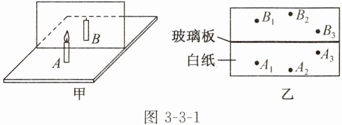 小阳利用如图 3 - 3 - 1 甲所示的装置探究平面镜成像的特点。他在水平桌面上铺一张白纸,将一块玻璃板竖立在白纸上,把点燃的蜡烛 $ A $ 放在玻璃板前面,使另一相同的蜡烛 $ B $ 竖立在玻璃板后面,从不同角度透过玻璃板看,移动蜡烛 $ B $ 直到它跟蜡烛 $ A $ 的像都完全重合。改变蜡烛 $ A $ 的位置,重复上述步骤,再做两次实验,并把三次实验中蜡烛 $ A $ 和 $ B $ 的位置记录在白纸上,如图 3 - 3 - 1 乙所示。