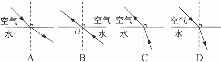 D [解析]潜水员在水中看岸上的树木时,入射光线应从空气中经水面斜射入水中,故B、C错误;光从空气中斜射入水中时,折射角小于入射角,故A错误,D正确。