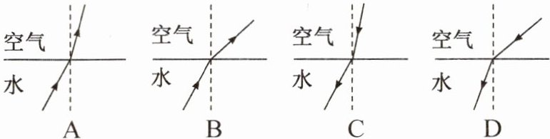 D [解析]射水鱼观察到小昆虫时,昆虫反射的光斜射向水面,经水面折射后再进入射水鱼的眼睛中,由此可知光的传播路径是由空气到水中的,故A、B错误。当光从空气中斜射入水中时,折射光线向法线偏折,故C错误,D正确。