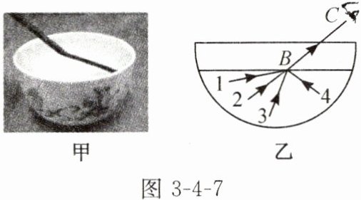 5. 如图 3 - 4 - 7 甲所示,将筷子斜插入碗中的水,斜看时水下部分会发生弯折,这是光的______现象。如图 3 - 4 - 7 乙所示,筷子最下端反射出的一条光线经水面折射后沿 BC 方向出射,则该光线最接近题图乙中的______(填数字编号)。