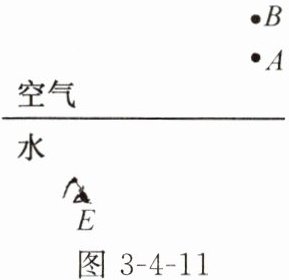 9. 如图 3 - 4 - 11 所示,在平静的湖边上方有一盏路灯,潜水员在水下 E 处看到了路灯的像。图中 A、B 两点中有一点是路灯的发光点,另一点是路灯的像点。请你判断发光点和像点,并在图中画出水下 E 处的潜水员看到路灯的光路图。