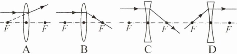 B 【解析】A图中的入射光线平行于主光轴,经过凸透镜折射后光线应该过焦点,故A错误。凹透镜对光有发散作用,而C、D中的凹透镜使光线起会聚作用,故C、D错误。