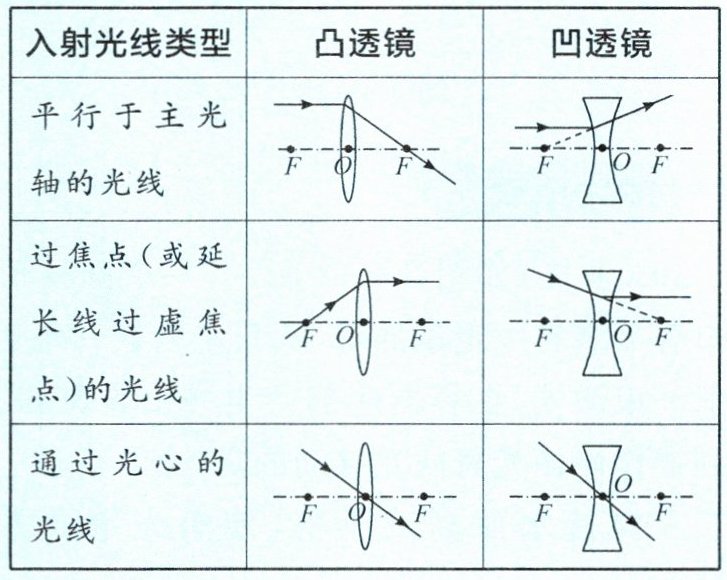 小锦囊 通过透镜的三条特殊光线如下表所示,注意凸透镜和凹透镜的区别。