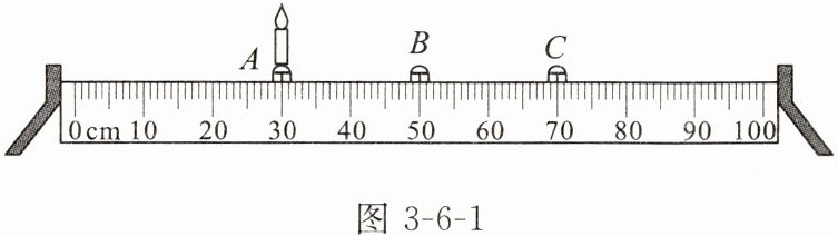 (1)实验时,首先在光具座上放置实验器材,若光具座$A$处放置蜡烛(如图3 - 6 - 1所示),则$C$处应放置______(选填“凸透镜”或“光屏”)。器材正确放置后,还应对其进行调整,使烛焰和光屏的中心位于凸透镜的______上。