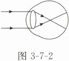 例 1 图 3 - 7 - 2 是某人眼睛看物体时的成像示意图,则他的眼睛类型及矫正需要选用的透镜分别是( )。