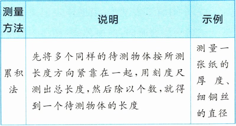 |累积法|先将多个同样的待测物体按所测长度方向紧靠在一起,用刻度尺测出总长度,然后除以个数,就得到一个待测物体的长度|测量一张纸的厚度、细铜丝的直径|