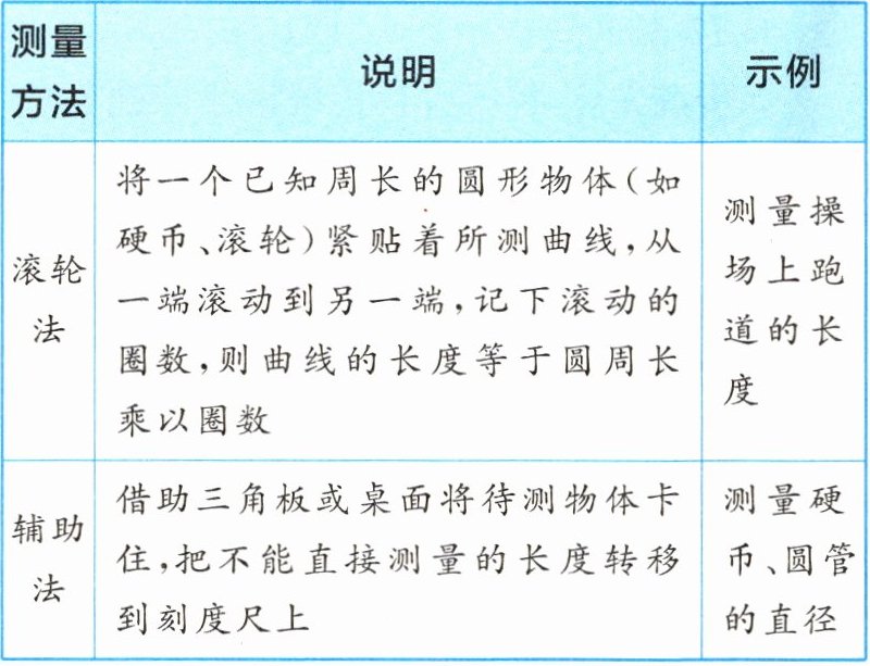 |辅助法|借助三角板或桌面将待测物体卡住,把不能直接测量的长度转移到刻度尺上|测量硬币、圆管的直径|