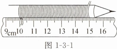 例 某同学欲测量一根细铜丝的直径,他先将细铜丝拉直,然后用刻度尺测出细铜丝的长度为 $ l_1 $,接着将这段细铜丝紧密排绕在圆柱形铅笔杆上(图 $ 1 - 3 - 1 $),数出缠绕在铅笔杆上细铜丝的圈数 $ n = 30 $ 圈,用刻度尺测出铅笔杆上铜丝线圈的总长度为 $ l_2 $。