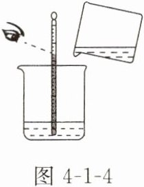 5. 小陈测量烧杯中热水的温度时,将很少的热水倒入另一烧杯中,然后用如图4-1-4所示的方式测量和读数。小芳对小陈的做法提出下列自己的看法,其中错误的是( )。