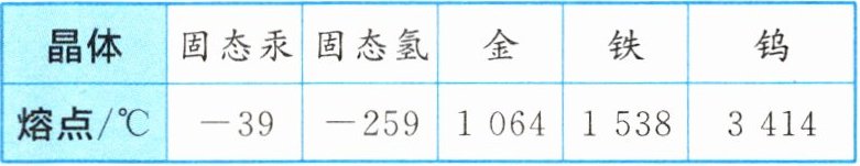 | 熔点/℃ | -39 | -259 | 1064 | 1538 | 3414 |