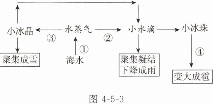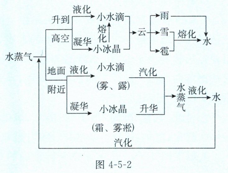 小锦囊 云、雨、雹、雪、露、霜、雾的形成与水的物态变化密切相关,其变化关系如图4-5-2所示。