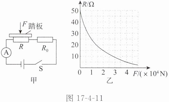 10. 科技应用 公路部门一般通过地磅检测汽车的载重情况。图17-4-11甲是跨学科学习团队设计的可视化地磅的电路原理图,其主要由踏板(重力不计)、压力传感器 $ R $、显示承重的仪表(实质为电流表,量程为 $ 0 \sim 0.6 A $)等组成,$ R $ 的阻值与所受压力 $ F $ 大小的关系如图17-4-11乙所示。电源电压为 $ 12 V $,定值电阻 $ R_0 $ 的阻值为 $ 5 \Omega $。求: