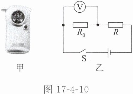 9. “喝酒不开车,开车不喝酒!”开车禁酒令如今已深入人心。图17-4-10甲是酒精浓度测试仪,图17-4-10乙是它的工作原理图,$ R_0 $ 是定值电阻,$ R $ 为气敏电阻。已知人体呼出的酒精气体浓度越小,$ R $ 的阻值越大。下列说法正确的是( )