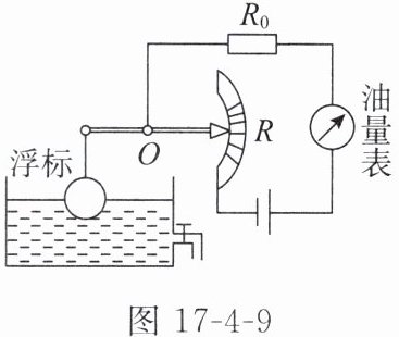 8. 科技应用(多选)如图17-4-9是一种测定油箱内油量的装置,从油量表指针所指的刻度,就可以知道油箱内油量的多少。$ R $ 是滑动变阻器,它的金属滑片是杠杆的一端,$ R_0 $ 是定值电阻,关于该装置下列说法正确的是( )