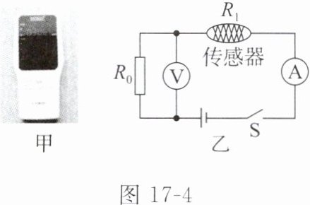例 3 科技应用 如图 17 - 4 甲所示是一款雾霾浓度检测仪,其检测原理如图 17 - 4 乙所示,$ R_0 $是定值电阻,传感器$ R_1 $的电阻随雾霾浓度的增大而减小。闭合开关$ S $,当雾霾浓度增大时,下列说法正确的是( )