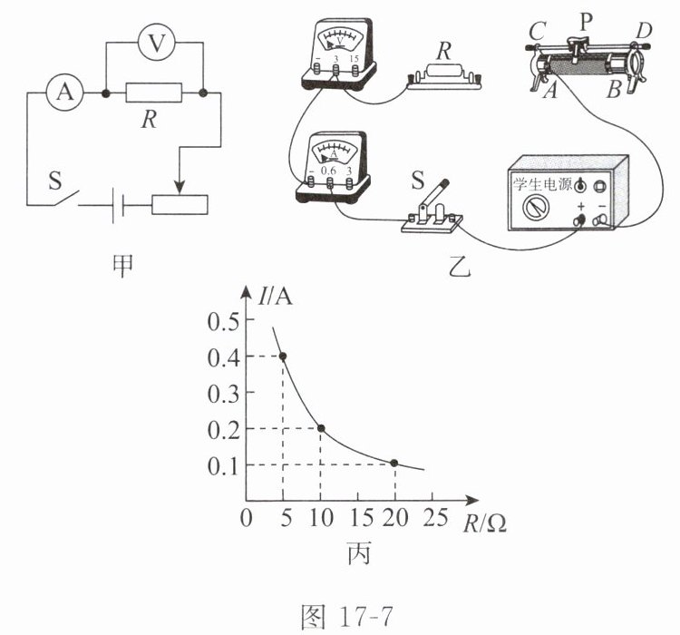 (4)排除故障后,小鹏又取了两个定值电阻,想利用这些器材继续探究“电压不变时,电流与电阻的关系”。实验所用电阻的阻值分别为$ 5 \Omega $、$ 10 \Omega $、$ 20 \Omega $,电源电压为$ 6 V $。将$ 5 \Omega 的电阻改接为 10 \Omega $的电阻后,应向______(选填“$ A $”或“$ B $”)端调节滑动变阻器的滑片。多次测量,记录数据,并绘制出如图 17 - 7 丙所示的图像。由图像可以得出结论:______。