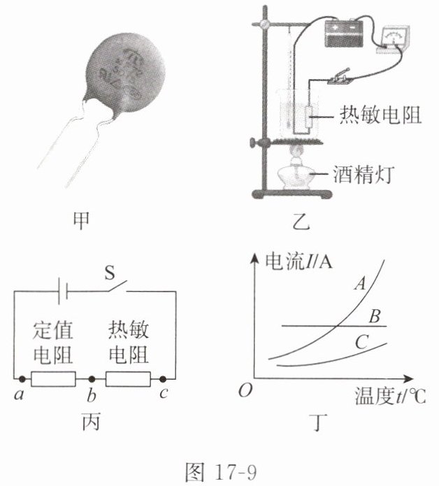 (3)实验小组要将该热敏电阻和一个电压表改装成一个指针式温度计,设计的电路如图 17 - 9 丙所示,若要使电压表示数随温度升高而增大,则应将电压表并联在______(选填“$ ab $”“$ bc $”或“$ ac $”)两端。