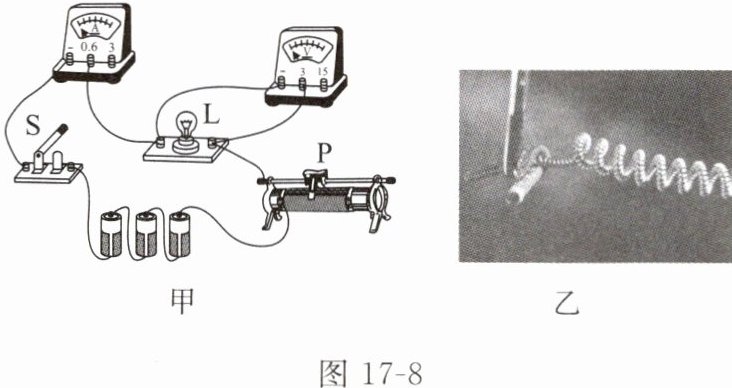 (4)细心的同学在实验过程中发现灯丝呈螺旋状,如图 17 - 8 乙所示,查询资料后得知,这是为了使灯泡具有一定的电阻,灯丝设计成螺旋状能增大灯泡的电阻的原因:______。(任写一条)