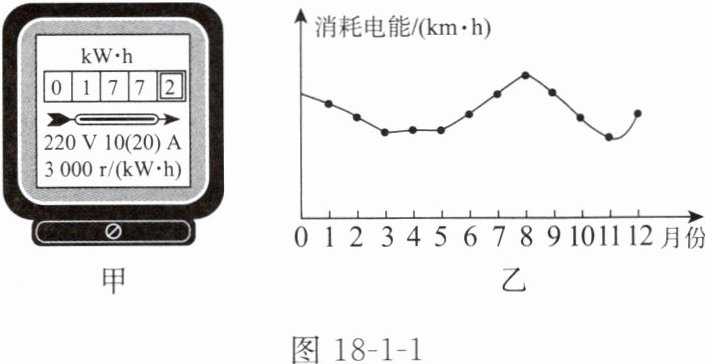 例2 月底时物业公司的工作人员来小宇家收电费,他观察了小宇家楼下如图18-1-1甲所示的电能表,这是用来测量______的仪表,然后从笔记本上查出该电能表上个月的示数是106.7kW·h,若按每度电0.6元计算,小宇家本月应该缴电费______元。图18-1-1乙是去年小宇家的耗电情况,小宇家______月份用电最多。