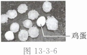 5. 冰雹是常见的自然灾害之一,一些冰雹比鸡蛋还大(如图13-3-6),破坏力很强。冰雹从高空落到地面时速度很大,其能量转化是重力势能转化为____;若某冰雹在下落过程中质量不变,则其内能____。