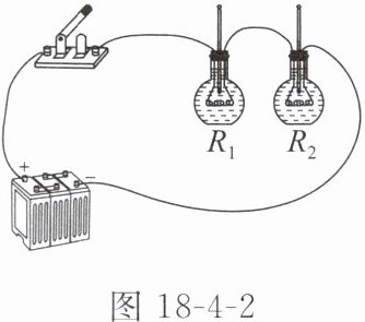 1. 探究“影响电流热效应的因素”的实验装置如图18-4-2所示,将$R_1、$$R_2$两电阻丝密封在两只完全相同的烧瓶内,且$R_1>R_2,$瓶内装入质量和初温均相等的煤油,下列说法错误的是( )
