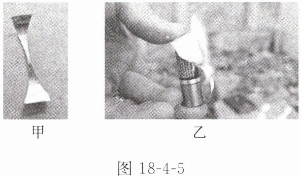 7. 实验创新央视某科普节目中,主持人做了“用电池和口香糖锡纸制作取火工具”的实验。如图18-4-5甲所示,将口香糖的锡箔纸包装剥下来,用小刀裁成细条,做成两头宽、中间窄的纺锤形状,把锡箔纸两头有亮光的一面(锡箔),分别用手固定在干电池的正、负极上,锡箔纸中间狭窄的部分很快燃烧起来,如图18-4-5乙所示。下列关于此情景的说法正确的是( )