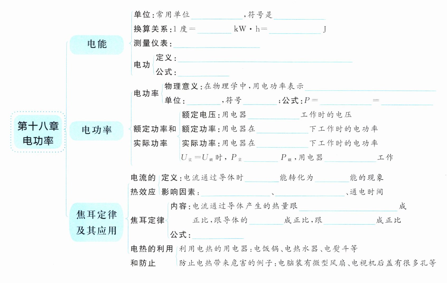 千瓦时 kW·h 1 3.6×10⁶ 电能表 电流做的功 W=UIt 电流做功的快慢 瓦特 W $\frac{W}{t}$ UI 正常 额定电压 实际电压 = 正常 电 内 电流 电阻 电流的二次方 电阻 通电时间 Q=I²Rt