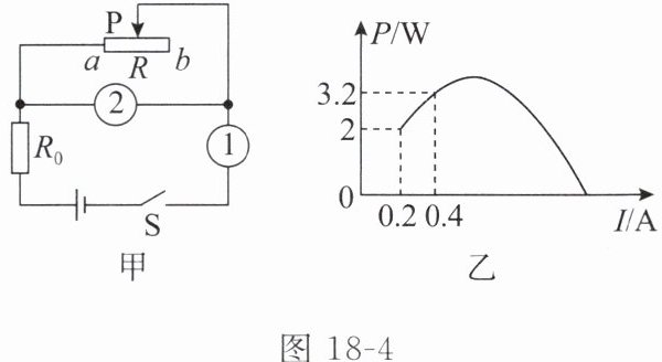 2. 在图 18 - 4 甲所示电路中,电源电压保持不变,$R_{0}$为定值电阻,$R$ 为滑动变阻器。当滑片 $P$ 由 $b$ 端移动到 $a$ 端的过程中,分别测出几组对应的电压值和电流值,通过计算得出滑动变阻器对应的电功率 $P$,并画出滑动变阻器的电功率 $P$ 和电流 $I$ 的关系图像,如图 18 - 4 乙所示。下列说法正确的是( )