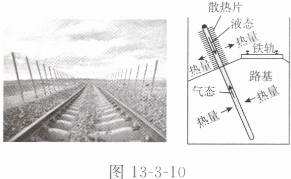 9. 跨学科冻土问题是世界级的工程难题。由我国自行设计、建设的青藏铁路,其格拉(格尔木—拉萨)段成功穿越了约550km的连续多年冻土区,是全球目前穿越高原、高寒及多年冻土地区的最长铁路。多年冻土的活动层反复冻融及冬季不完全冻结,会危及铁路路基。青藏铁路建设团队创造性地提出了“主动降温、冷却路基、保护冻土”的新思路,采用了热棒新技术等措施。图13-3-10为青藏铁路路基两侧的热棒照片及其散热工作原理示意图。热棒地上部分为冷凝段,地下部分为蒸发段,当冷凝段温度低于蒸发段温度时,蒸发段液态物质汽化上升,在冷凝段冷却成液态,回流到蒸发段,循环往复。