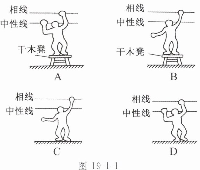 例2(多选)如图19-1-1所示,电工维修电路时需要带电操作。下列操作会发生触电事故的是( )