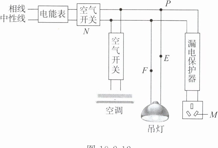 D 【解析】家庭电路中,控制用电器的开关应接在相线和用电器之间,这样在开关断开时,用电器上不带电,故开关应接在E处,A错误;题图中P处为相线,正常状况下,用测电笔接触P点,氖管会发光,B错误;当N处的空气开关跳闸时,可能是用电器的总功率过大,也可能是电路中发生了短路,C错误;M点接的是相线,站在地上的人不小心用手指接触M内的相线时,电流会通过人体进入大地,此时漏电保护器会迅速切断电流,对人体起到保护作用,D正确。