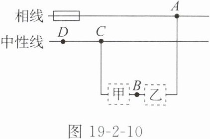 6. 如图19-2-10所示的家庭电路中,两虚线框内连入了电灯和开关,则方框______中为开关;闭合开关后,发现电灯不亮,使用测电笔测试A、B、C三点时测电笔的氖管均发光,测试D点时测电笔的氖管不发光,则该电路的故障为______。