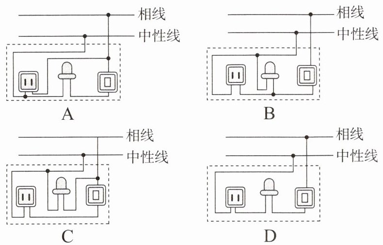 B 【解析】开关闭合时指示灯发光、插孔正常通电,说明开关同时控制灯泡和插座;若指示灯损坏,开关闭合时插孔也能正常通电,则说明灯泡和插座之间是并联的。开关要接在相线和用电器之间,B正确。