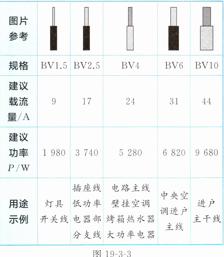 参考图 19-3-3,根据计算出的各配电分支回路的总功率,为各回路选择合适的电线。