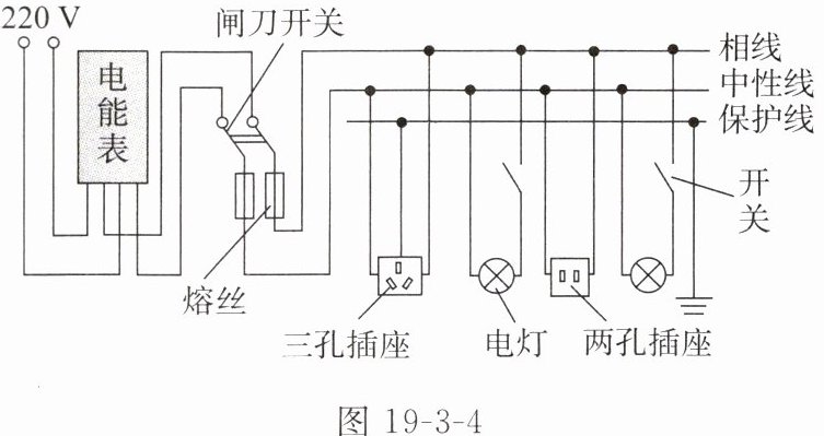 一般家庭电路组成示意图如图 19-3-4 所示,结合本章所学知识回答以下问题。