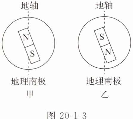 3. 地磁场的分布与条形磁体的磁场相似,在图20-1-3甲、乙的两个示意图中,能合理描述地磁场的是____图;由图可见地磁两极和地理两极之间存在着夹角,最早发现这一现象的是中国宋代学者____;只受地磁场影响时,静止的小磁针的N极指向地理的____(选填“南”或“北”)极附近。
