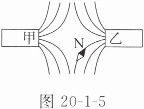 3. 如下页图20-1-5所示,甲、乙为不同条形磁体的两个磁极,弧线是部分未标方向的磁感线。根据图中小磁针静止时的指向判断甲、乙的磁极,下列描述正确的是( )