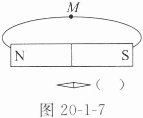 6. 如图20-1-7所示,请在括号中标出小磁针静止时右侧磁极的名称,并用箭头在M点标出磁感线的方向。